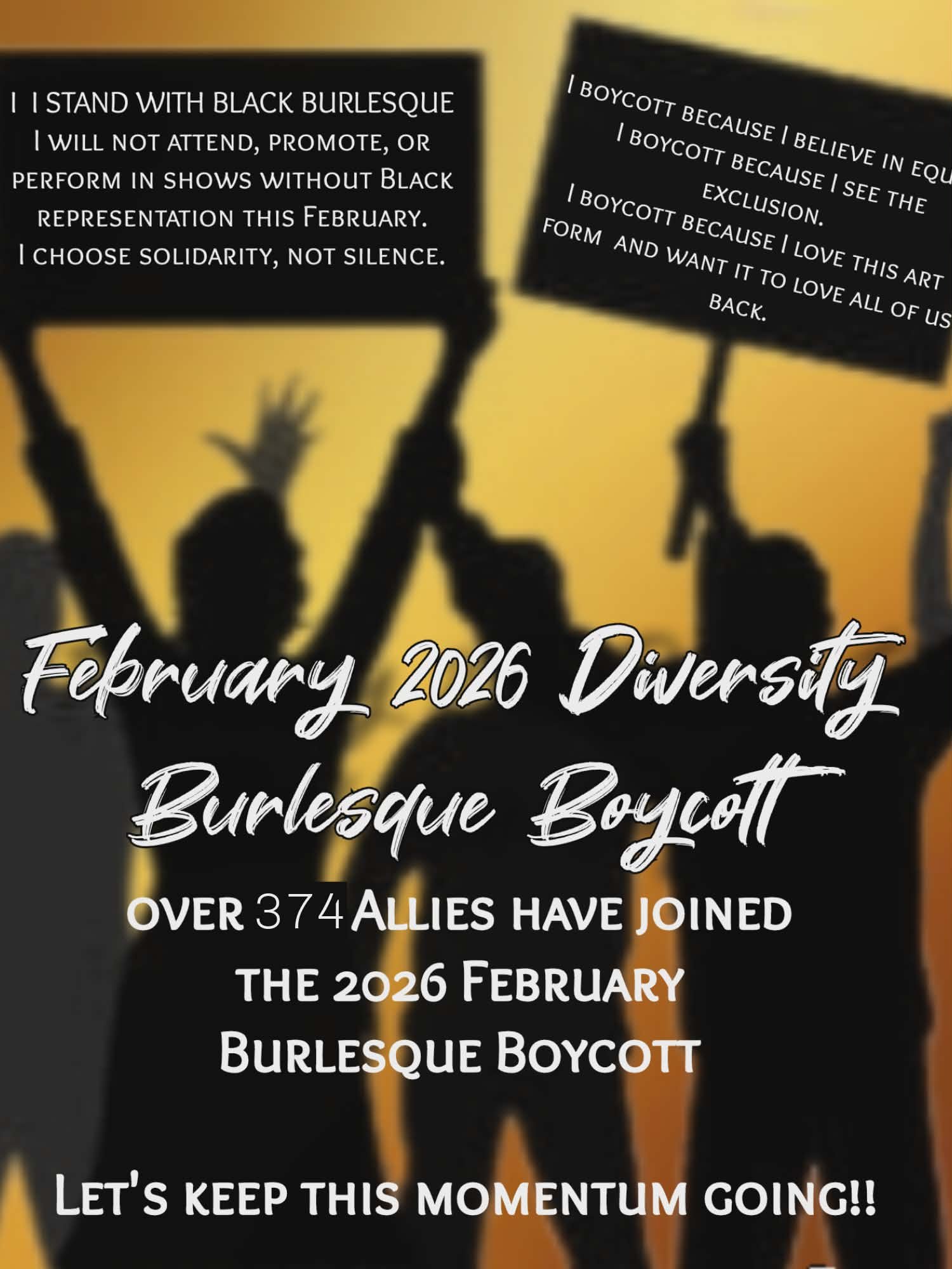 The February 2026 Diversity Burlesque Boycott is a collective action organized by Cocoa Pearlesque to show support to Black Burlesque Artists with personal donations as well as withholding support from shows who don’t include Black Artists in their events throughout February.